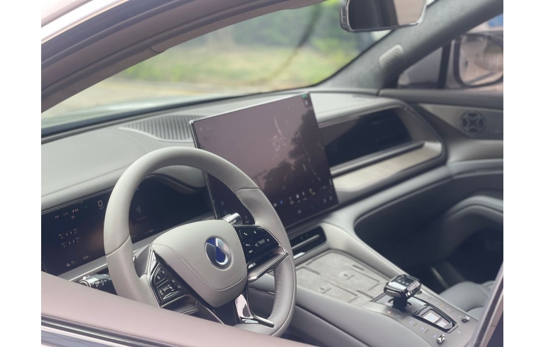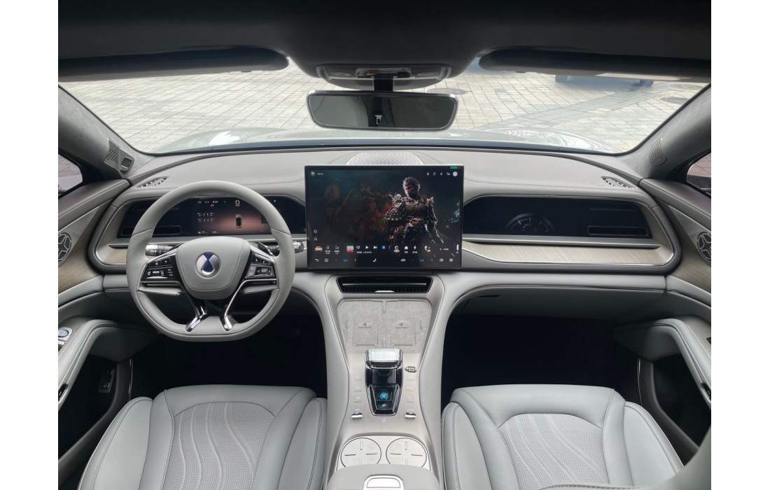 Інтер’єр автомобіля Denza N7 вирізняється простором, технологічністю та преміальним комфортом. Салон оформлений із використанням високоякісних матеріалів, включаючи м’яку шкіру, декоративні вставки та атмосферне підсвічування, що створює затишну і сучасну атмосферу. Центральне місце займає великий панорамний дисплей із розширеним мультимедійним функціоналом, а також цифрова панель приладів для водія. Ергономічні сидіння з електричними регулюваннями, вентиляцією та масажем забезпечують максимальний комфорт у тривалих поїздках. Завдяки продуманому простору для всіх пасажирів, Denza N7 ідеально підходить як для щоденних поїздок, так і для далеких подорожей у повному складі.
